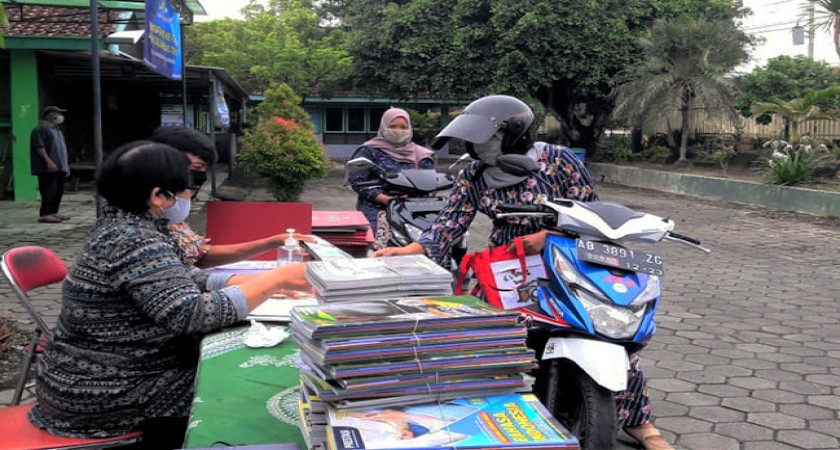 Sedayu - SMP 1 Sedayu Sabtu (31/1/2021) membagikan buku Lembar Kerja Peserta Didik (LKDP) Semester 2 dan Pengembalian Rapor ke sekolah secara Drive Thru atau lantatur (Layanan tanpa turun) untuk mencegah penyebaran covid-19. Orang tua yang mengambil LKPD juga harus dalam keadaan sehat, pakai masker, dan tetap jaga jarak, begitu juga petugas-petugas dari sekolah. Bagi orang tua yang sakit akan dilayani pada hari lain setelah benar-benar sehat. Lantatur hari ini untuk kelas IX, Senin untuk kelas VIII, dan Selasa untuk siswa kelas VII.